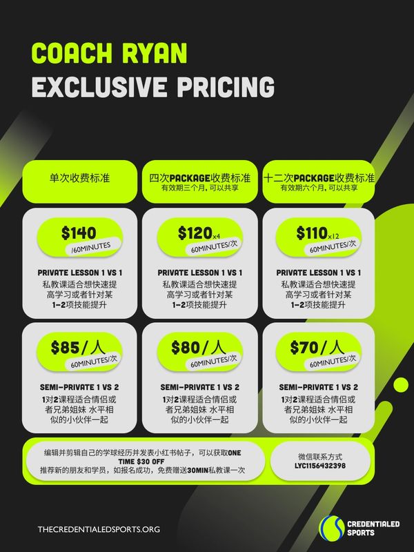 与总教练Ryan老师进行一对一或者一对二教学,所有课程均为与Ryan教练进行,单次预约时间或者固定一个日程,课程具体计划与学员商量决定,每一个课程都有具体有效期限制,具体说明请阅读上课须知。如果您选择套餐课程,请在下面的购物车中买单。